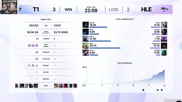 连追两把的HLE势头正盛,观众觉得T1要翻车,结果全员状态拉满,给HLE众人迎头痛击,多兰一手慎反制宙斯青钢影,对线3分钟就险些单杀,Oner看到Zeka选出卡萨丁,前期疯狂针对,7分钟抓死两次,下路Peyz泽丽对线压刀,决胜局T1全线优势,节奏一直领先,打得HLE找不着北。